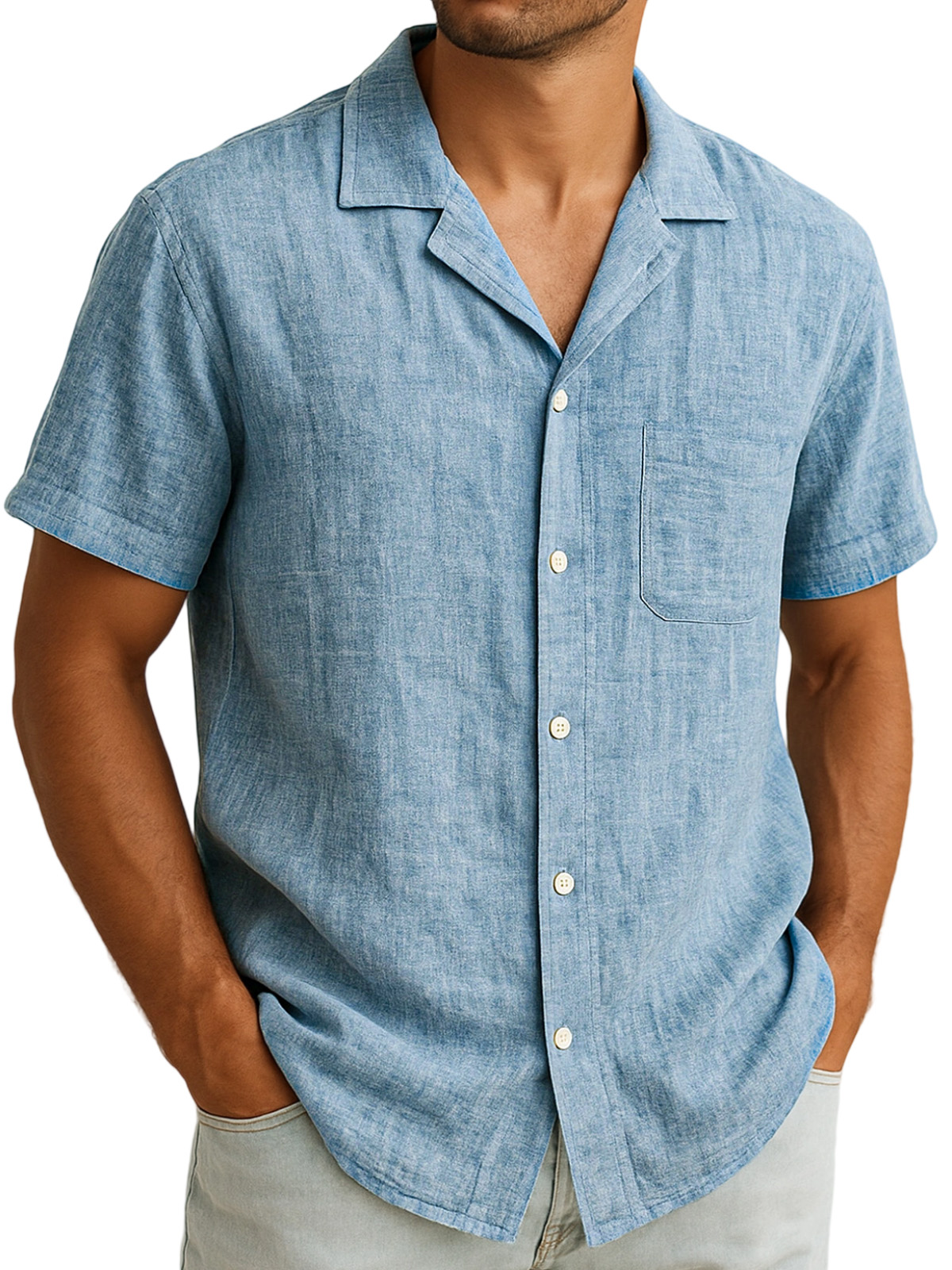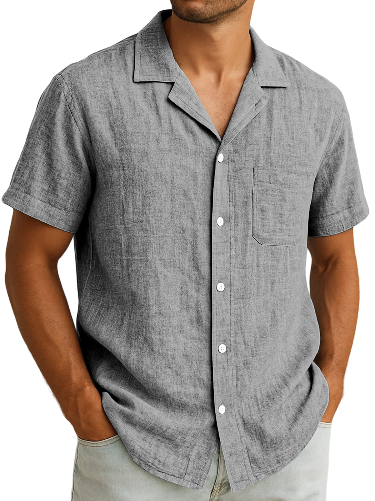 Herren Tägliches Baumwoll- und Leinen-Taschenrevers Freizeit Komfort Kurzarmhemd
