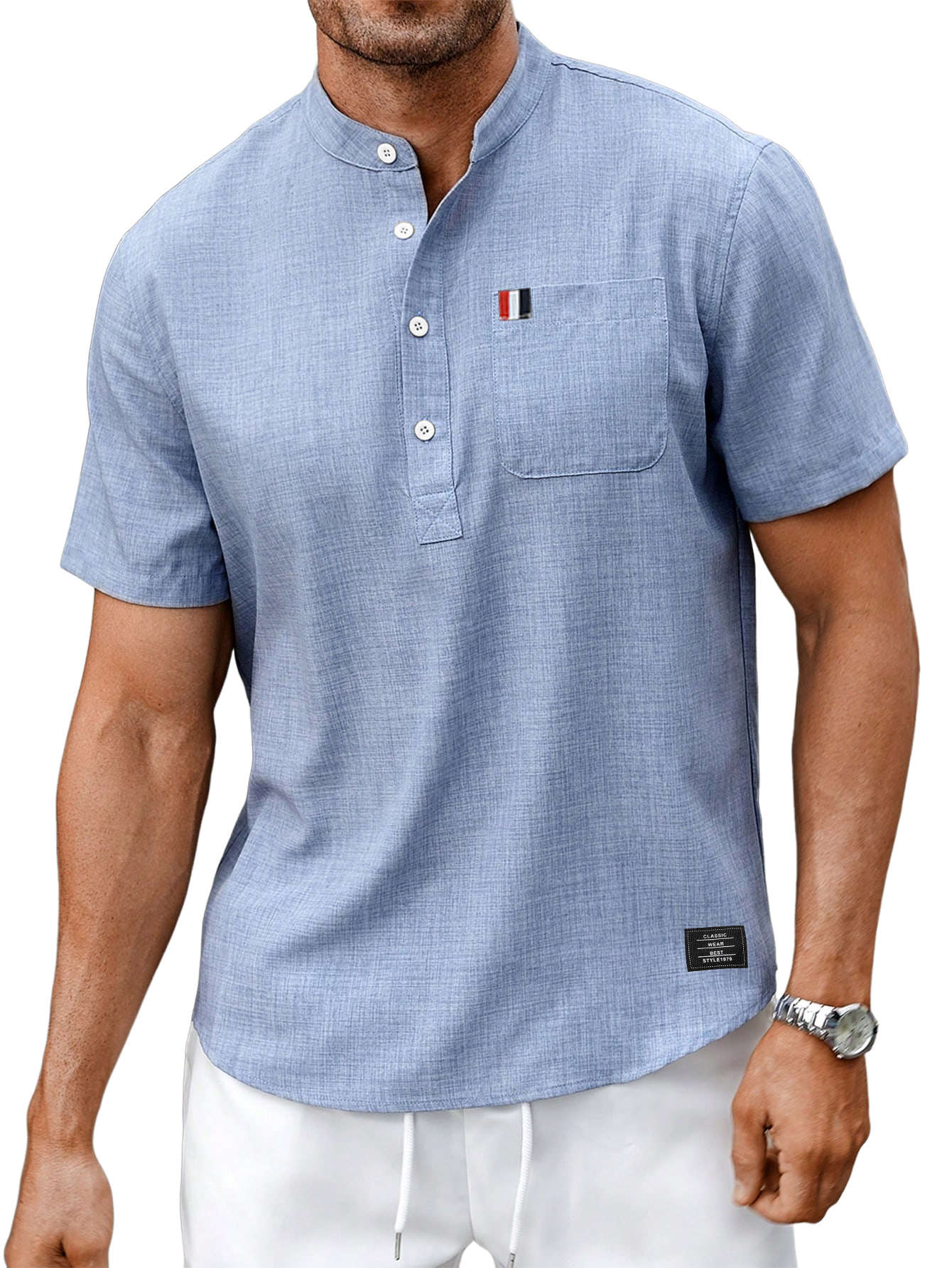 Herrenmode Freizeit Baumwoll- und Leinenlogo Stehkragen Tasche Kurzarmhemd