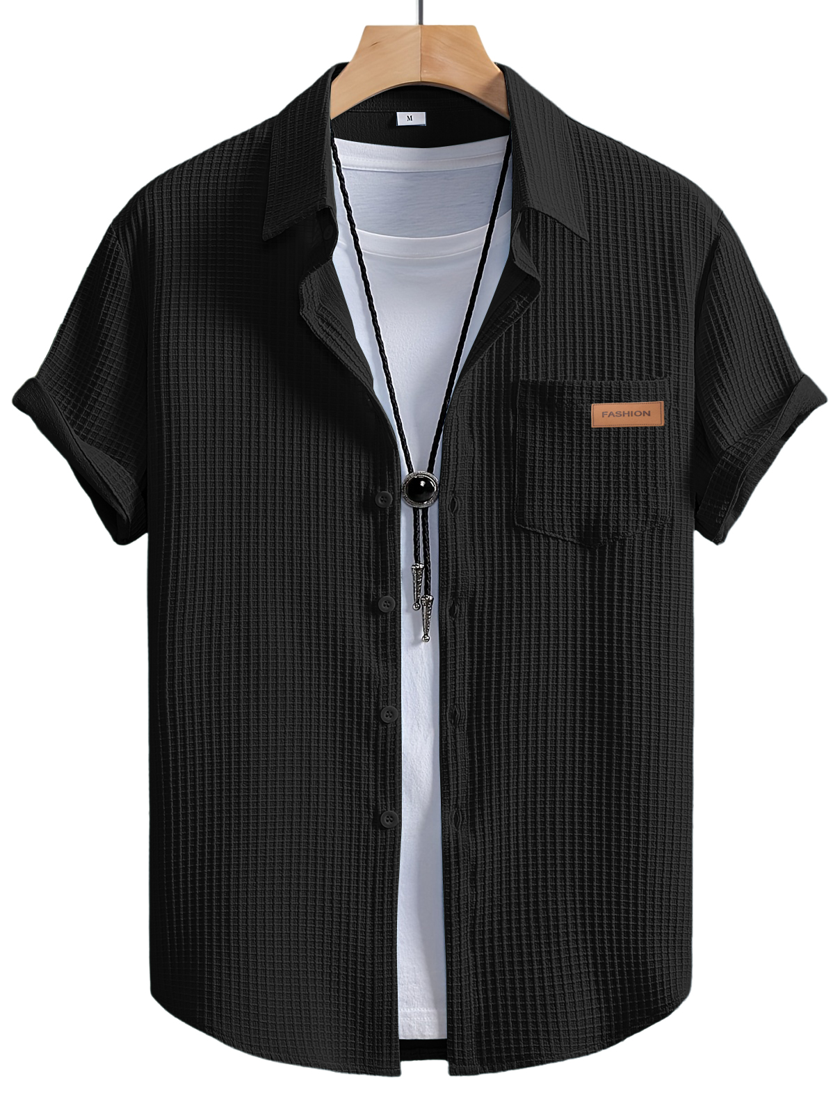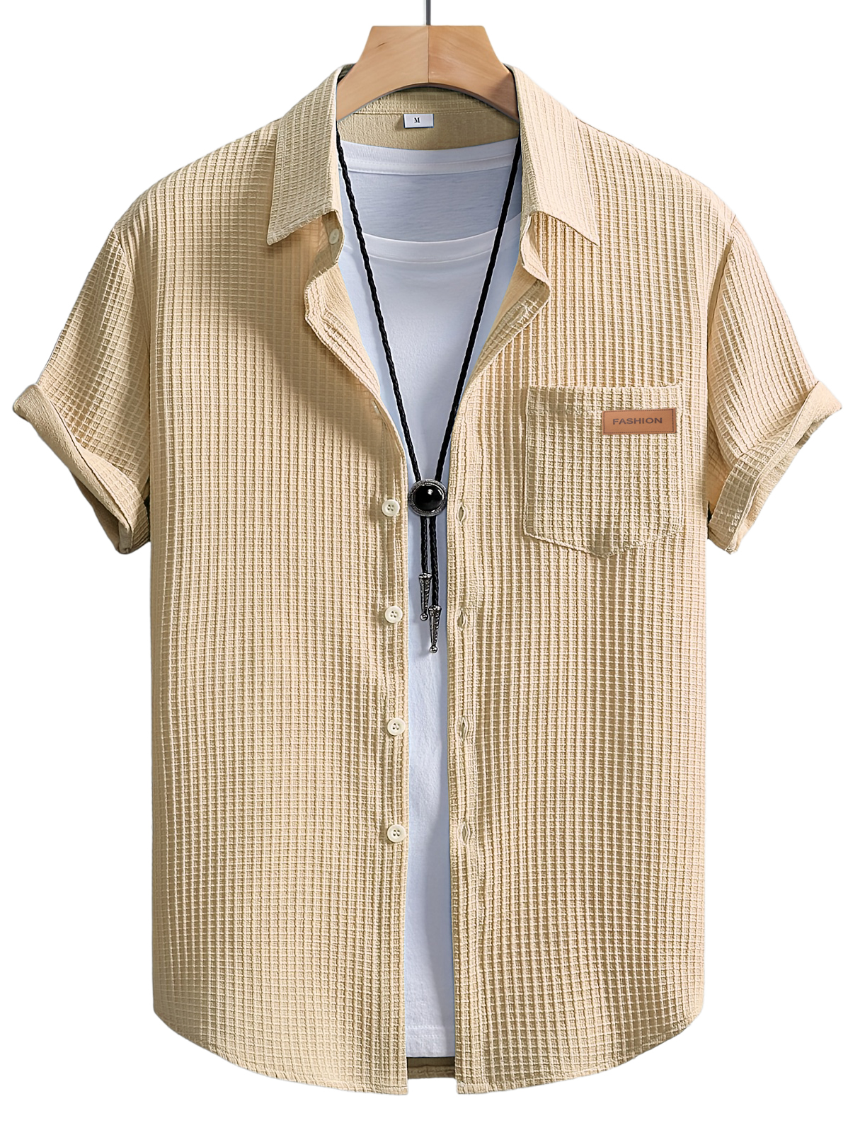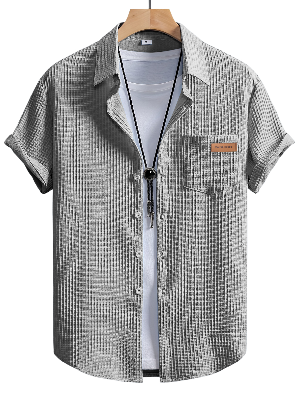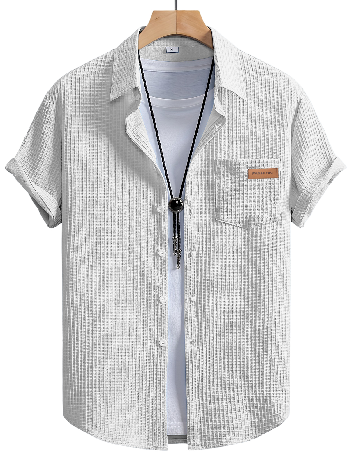 Herren Freizeit Retro Waffelstoff Taschenmode Logo Kurzarmhemd