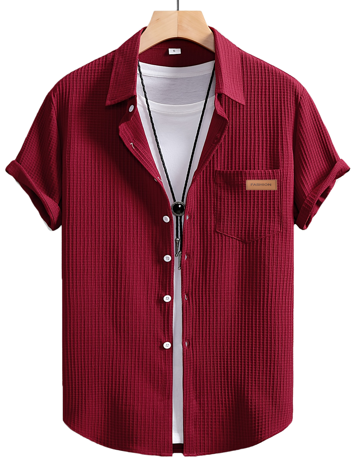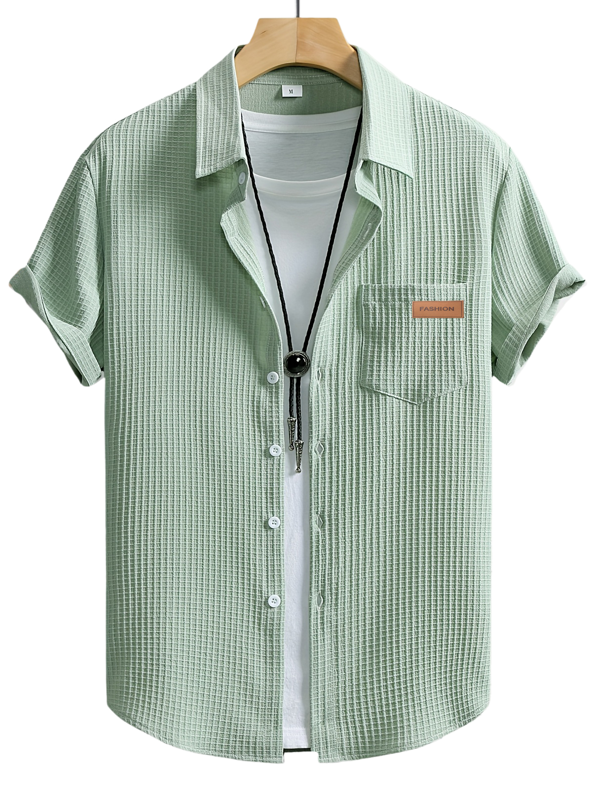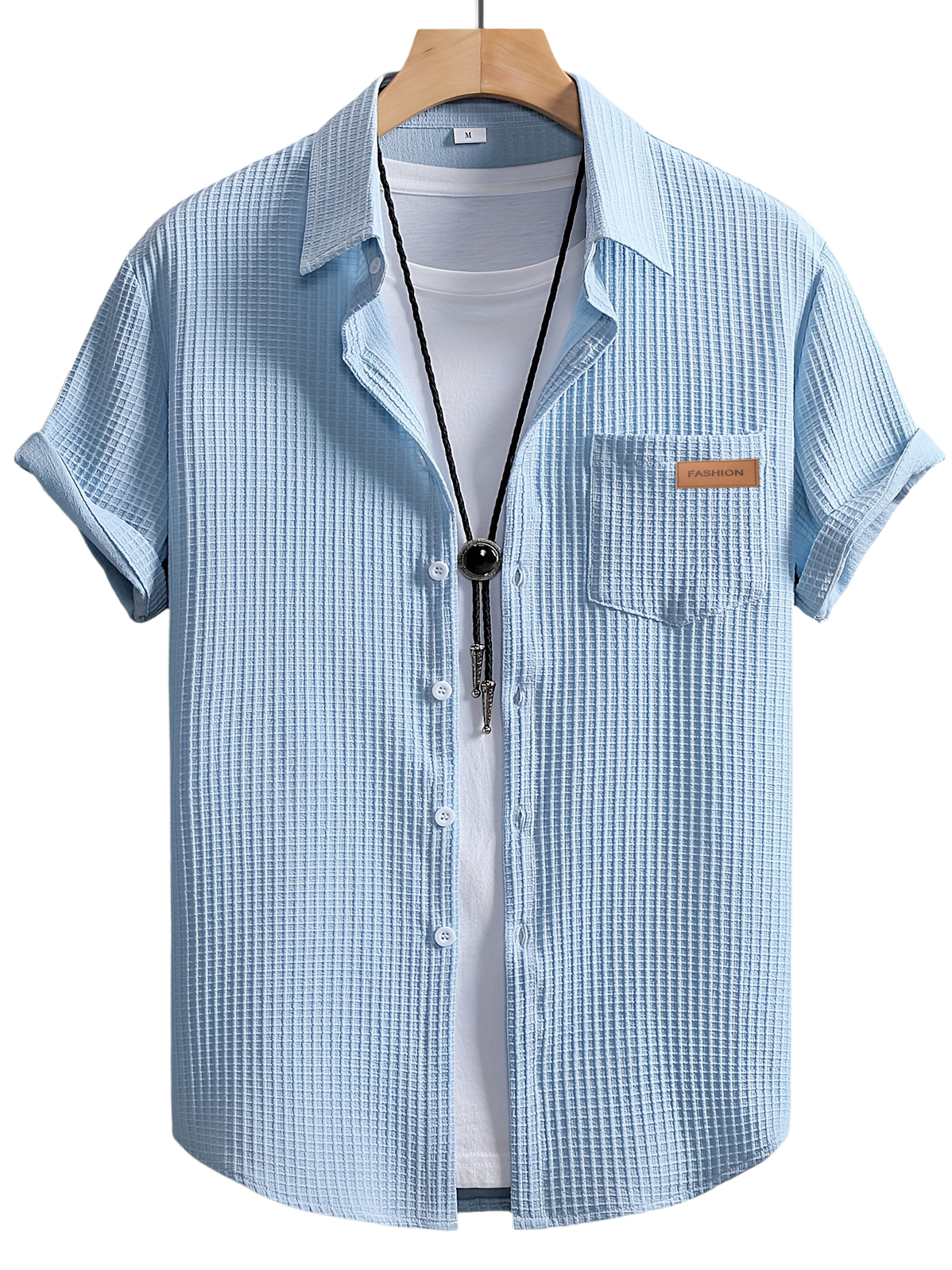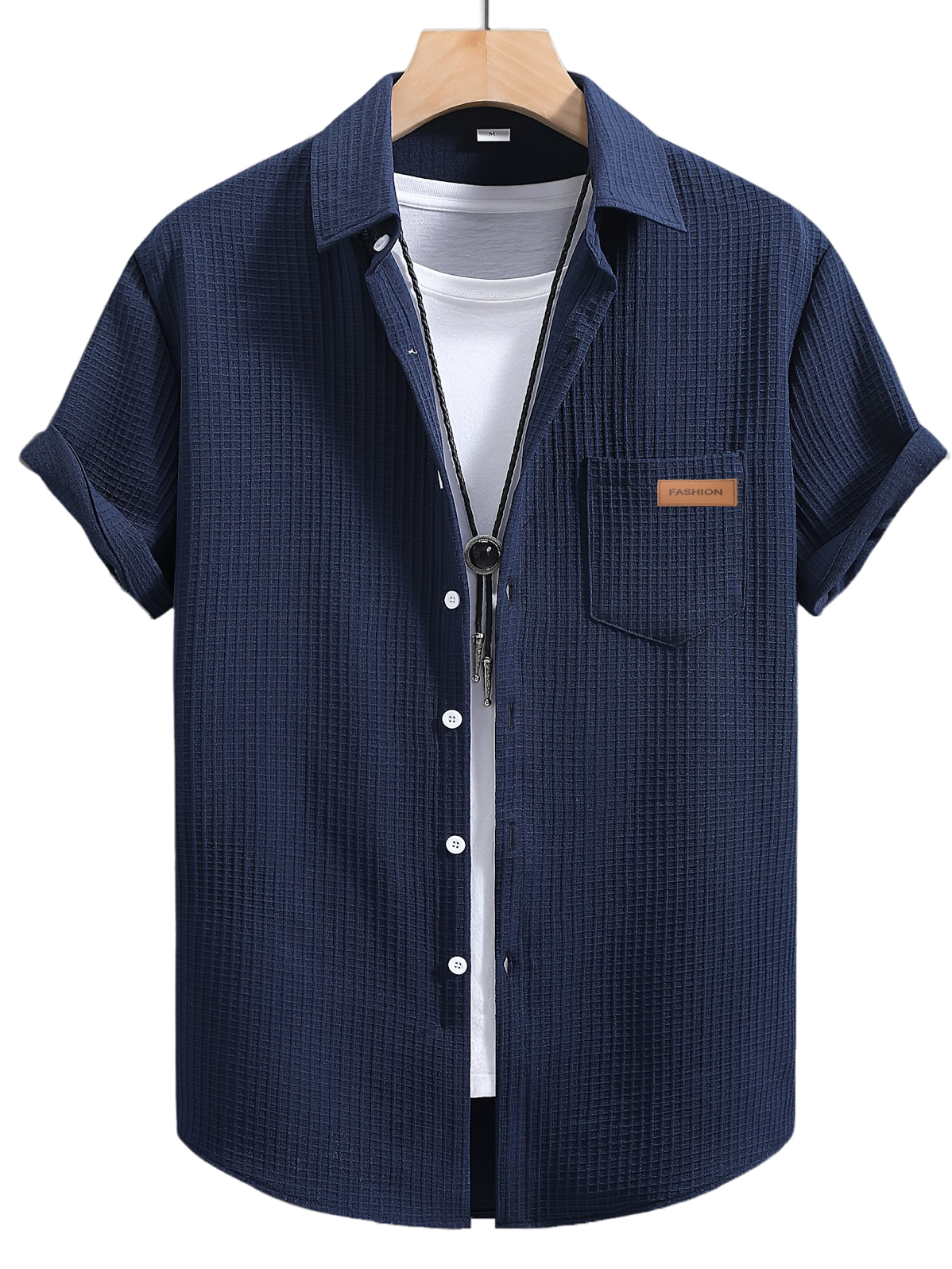 Herren Freizeit Retro Waffelstoff Taschenmode Logo Kurzarmhemd